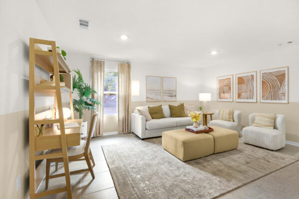 The laundry room is just steps away from the 2-car garage, ensuring plenty of space for storage and parking. Crafted with our unwavering commitment to quality, the Palmer incorporates energy smart features throughout. From the digital thermostat and a heating, ventilation, and A/C system to the roof vent and soffit for efficient attic ventilation, and dual pane energy-efficient windows, every detail is designed to enhance comfort and sustainability.